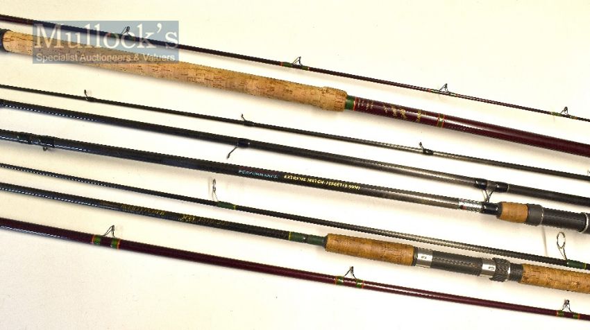 3x good carbon coarse rods – Max Performance Extreme Match 13ft 3pc with fuji style guides; Daiwa “Ivan Marks” Lightning 12ft 3pc; and Shakespeare Royalty Spin 10ft 2pc wt 10-40gms – all well looked after and in cloth bags
