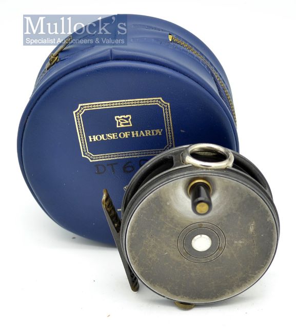 Scarce and unusual Hardy Bros Perfect alloy trout fly reel – 3 1/8” dia with twin line guards incl clear agate line guide, brass rim regulator in the L.H.W positon, nickel drum locking screw – ribbed brass foot – runs smoothly – comes in makers padded case