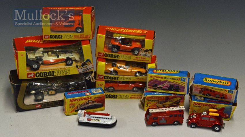 Selection of Corgi Toys and Matchbox Diecast Models to include Bond Bug 389, 395 Fire Bug, 377 Marcos 3 Litre, 372 Lancia Fulvia Sport Zagato, 151 Yardley McLaren M19A, 154 JPS Lotus, plus Matchbox Flying Bug 11, Fire Engine 35, Hovercraft 72, Mod Rod 1, 34 F1 Racing Car – with original boxes, 3x Loose models, mixed condition throughout F/G, boxes P in some cases, worth inspecting (11)