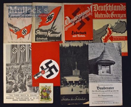 Various German Leaflets to include The Third Reich in Sound, The German Soldiers Songs pocket size booklet, Germany’s Bleeding Borders, National Socialist Song Treasure, freedom and battle songs, Storm and Fight, plus others, varying conditions (9)