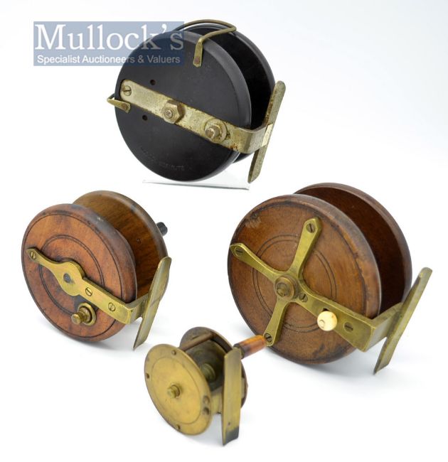 Collection of various different types of reels (4) – 2” brass crank wind with horn handle (G); 3.5” wooden and brass strap Nottingham reel with rear brass drum flange and on/off check – runs smoothly: 4” wooden and brass star back Nottingham reel with rear brass drum flange and back plate lined rim, on/off check – missing one handle – runs smoothly; and a Allcocks Aerialite 4” reel with replaced locking nut, bickerdyke line guide chrome strap back ( some speckle rusting)