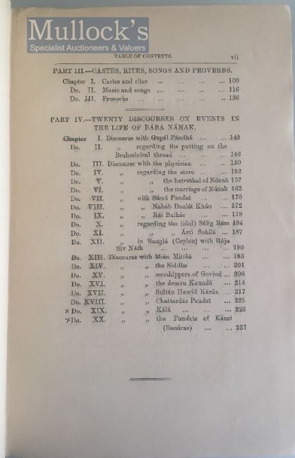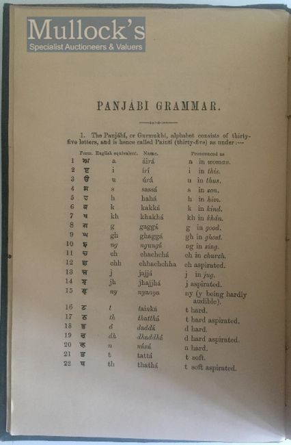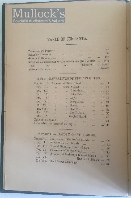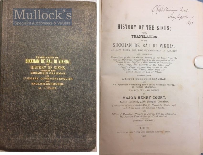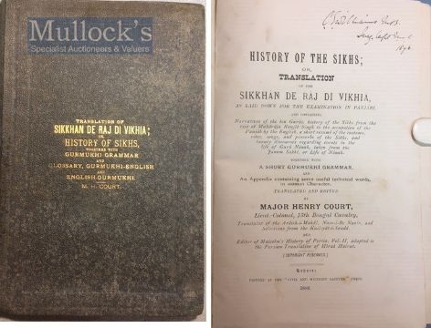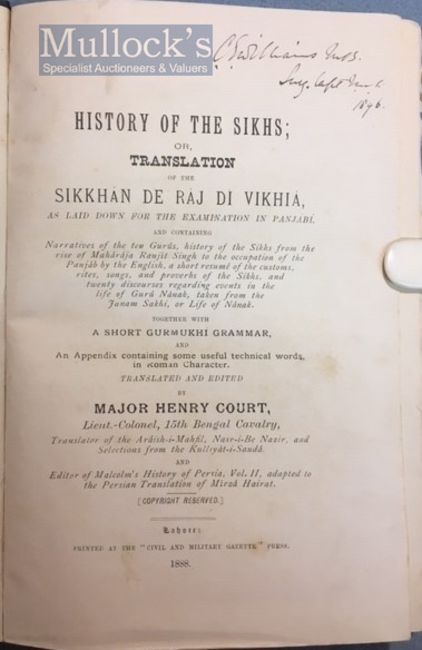 India & Punjab – History Of The Sikhs By Henry Court Book - A rare first edition of The History of the Sikhs; or, Translation of the Sikhan de raj di Vikhia, as laid down for the examination in Panjabi, and containing the Narratives of the ten Gurus, history of the Sikh from the rise of Maharajah Ranjit Singh to the occupation of the Panjab by the English, a short resume of the customs, rites, songs, and proverbs of the Sikhs, and Lie of Guru Nanak, taken from the Janam Sakhi, or Life of Nanak. Together with a short Gurmukhi grammar, and an appendix containing some useful technical words, in roman character. Translated and edited by Major Henry Court, Lieut- Colonel, 15th Bengal Cavalry, printed at Civil & Military Gazette Press, Lahore, 1888. In original dark green-blue cloth with gilt titles to front cover. A detailed study of the Punjab, the Sikh and their origins, a valuable source and early record for academics and scholars, scarce.