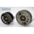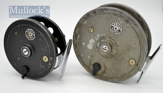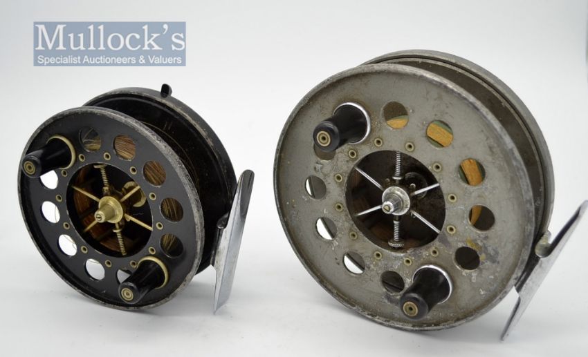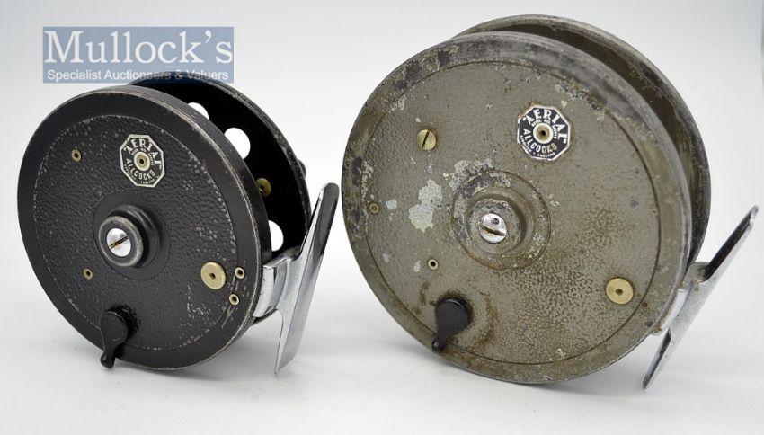 2x Allcock Aerials alloy centre pin reels - 3.75 inch diameter smooth chrome foot, on-off check, with the usual rim wear and back where-black bubble finish to the back plate-use nevertheless spins well: and 4.5” dia similar features with grey finish -well used with some corrosion to the face plate - otherwise spins well