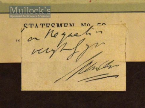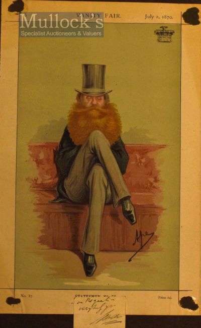 Autograph – 5th John Poyntz Spencer (1835-1910) - Earl of Spencer Vanity Chromolithograph Print – No.87 – Statesmen No 53 Earl Spencer by ‘Ape (Carlo Pellegrini) ‘The Messenger of Peace’ with cutting of signature in ink attached below, taken from Victorian scrap album, laid to paper mount, remnants of front mount to corners