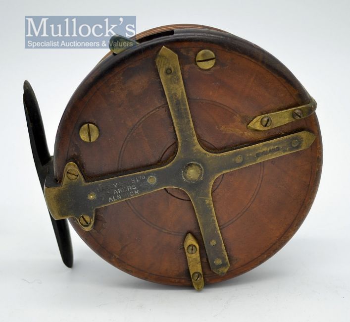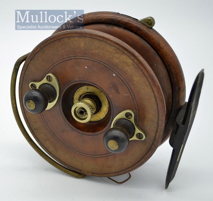 Scarce Hardy Bros Nottingham Silex Action wooden and brass star back reel c.1910 – 4.5” dia back plate, bickerdyke line guide, twin black handles, knurled locking nut, on/off rim lever check, knock the foot – appears all original.