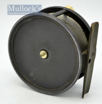Scarce Forrest Kelso “Patent Adjustable Drag” brass face Perfect style salmon reel – 4” dia with solid drum face, bronzed gun metal foot, constant check – runs smoothly