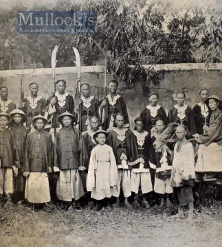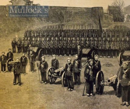China – ‘A Chinese Boxer Chief and his Braves’ Original Photographic illustration from a Military Journal 1900 20x23cm plus ‘A Field Battery of the Green Turbans, or foreign drilled Chinese Troops’ 1883 22x19cm and a German engraving showing a beheading in China, no date circa 1900, 29x22cm approx. all mounted to card (3)