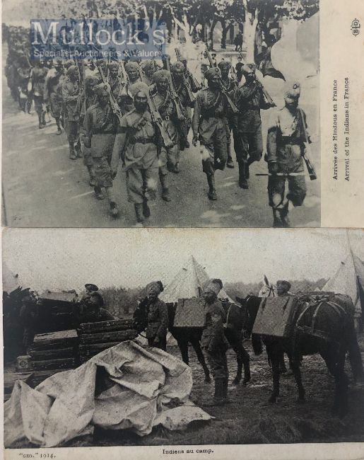 India & Punjab – Sikh Troops heading to Front in WWI Postcards Two original vintage First World War postcards of Sikhs soldiers arriving in France, heading to the western front, and the Indian camp in France, c.1914