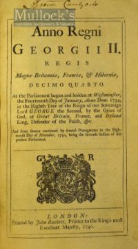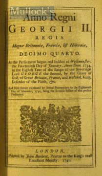 1740-1741 Acts of Parliament – 43 Acts complete in one volume each with separate title page with Royal Arms. Including Acts of Land Tax; stealing of sheep; supplying the City of Gloucester with Water; Licensing the importation of victual into Scotland; opening a trade to and from Persia through Russia; to indemnify protestant purchasers of estates of papists; to enable building a bridge crossing the River Thames, London Printed by John Baskett, Printer to the King’s most excellent Majesty, County of Brecon, worn covers, internally sound