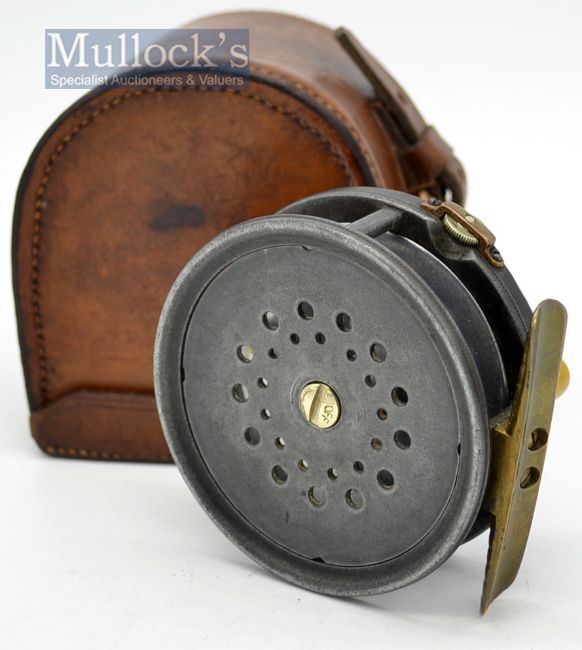 Hardy Bros Contracted Perfect alloy trout fly reel c. 1905/11 - 3 1/8” dia, 4 screw ribbed brass foot, brass strap over rim tension screw - slight bit of wear to back rim- runs smoothly and comes in period original leather block “D” shaped reel case