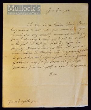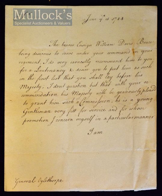 The founder of the Colony of Georgia America – General James Oglethorpe, founder of Georgia ms letter to Oglethorpe dated June 15th 1744 being a letter of introduction for Ensign William Davis Bruce ‘being desirous to serve under your command in your regiment...I don’t question but that with your recommendation his Majesty will be graciously pleased to grant him such a Commission, he is a young Gentleman very fit for service and for whose promotion I concern myself in a particular manner...’ The letter is unsigned. At this time Oglethorpe had returned to England after a considerable time in America where, amongst many things, he founded the Colony of Georgia.