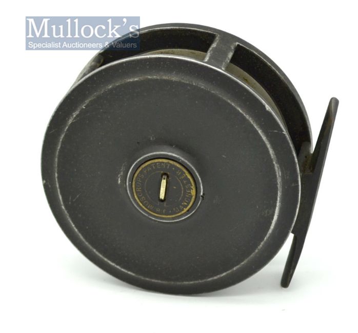 Scarce J.B Moscrop, Manchester 3” alloy patent brake dry fly reel – retailed by Fosters Ashbourne, horn handle, smooth brass foot – runs well.