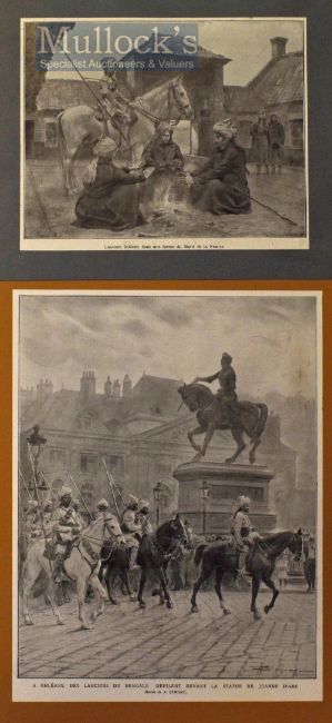 India WWI – ‘Bengal Lancer Passing the Statue of Jeanne D’Arc in Orleans French Lithographic illustration after a watercolour by Jose Simont 1915 30x23cm approx. on card. J Simont was an acclaimed war artist, together with ‘Indian Lancers around a fire in North France’ print after a watercolour by Paul Surrut 1914. P Surrut did many drawings of Indian Soldiers in France (2)
