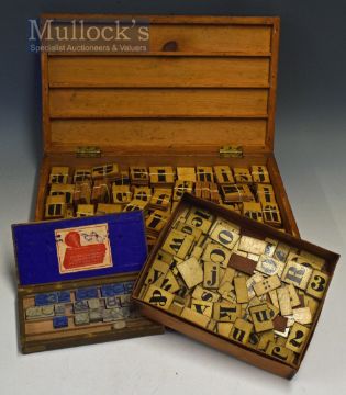 Victorian Schoolroom Educational Aid Complete set of alphabet and numbers on wood tiles housed in original box with lid for display together with another example and some rubber printing type (3)