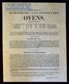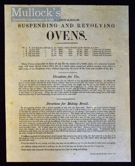 London – 1850 Broadside Portable Suspending and Revolving Oven (London) by Pettitt printers, Soho, with a neat repair, printed on one side, single sheet, an advert for a domestic bread oven that can be used by suspending in front of a fire