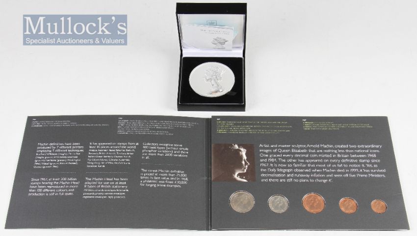 2007 Limited Edition The Machin Head Medallion Hand Crafted hallmarked .925 silver medallion cased together with 40th Anniversary presentation set consisting of 1/2p, 1p, p2, 5p, 10p complete with a set of 16 stamps (2)