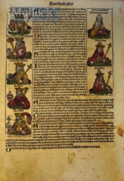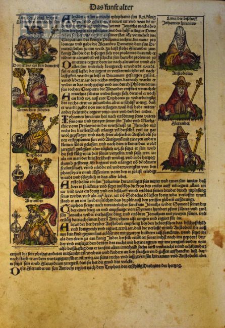 Single Leaf From The Nuremburg Chronicle - This is fine leaf from the German version of the Liber Chronicarum, printed in December 1493, five months after the original Latin edition, which was printed in 1493. The illustrations are finely handcoloured began by Michael Wolgemut in 1487 with William Pleyenwurff his son, with the designs of the woodcuts. Also some work was done by the young Albrecht Durer when apprenticed there. The translation into German was done by George Alt and was printed in Nuremburg by Anton Koberger, Large size of 11½” × 16¾” (290mm × 425mm).