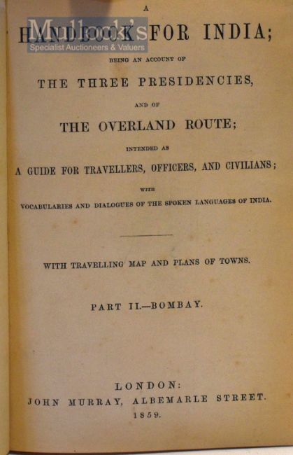 A Handbook For India 1859 Book - Being An Account Of The Three Presidencies, And Of The Overland Route; Intended as a Guide for Travellers, Officers, and Civilians; with Vocabularies and Dialogues of the Spoken Languages of India. With Travelling Map and Plans of Towns, Part II – Bombay. The author was E. B. Eastwick, London: John Murray, large folding map to rear, much detail and interesting insights into life and travel in Bombay, Konkan, Gujarat and Sindh more than 150 years ago