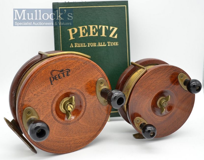 2x Peetz Canada Classic Fishing Handcrafted Mahogany and Brass fishing reels and signed book (3) – incl 6” dia (Sea) and 4.75” dia (Salmon) both with rear flanged drum spools and lined back plates, brass bickerdyke line guides and on/off checks and central drag winged nuts – very lightly used – and comes with book “Peetz –A reel for All Time” signed by the author Douglas Pollard to the front free end plate (VG)