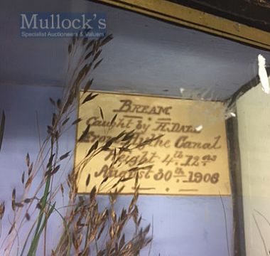 Early J Cooper & Sons 28 Radnor Street preserved Bream dated 1908 - mounted in glass bow fronted case with makers label to the top left hand corner c/w paper label to the top right corner and original period gilt inscription “Bream-Caught by H. Dale, from the Hythe Canal, August 30th, 1908, Wgt 4lbs 12oz” overall 15.75” x 27.7” x 5.75” – some wear along the top and bottom front edge – untouched.
