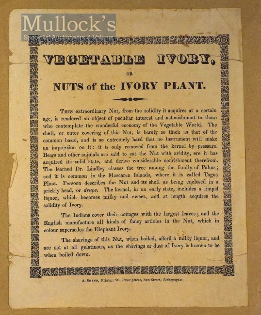 c.1830 Broadside ‘Vegetable Ivory or Nuts of the Ivory Plant’ A. Shand, London printers, a description of the nut and its uses. It grows on a palm which is found along the Pacific Seaboard of South America from Panama to Peru. The palm is also found in the Mascaren Islands of the Indian Ocean where it is known as the Tagua Plant, single sheet, laid on album sheet