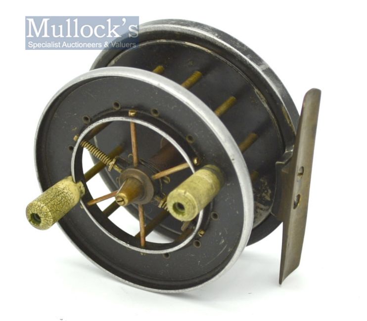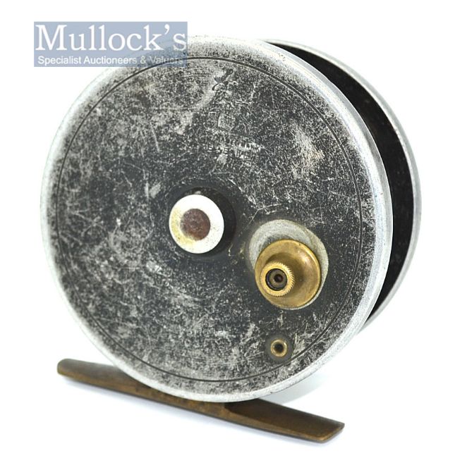 Allcocks Aerial Popular 3” wide alloy drum centre pin reel - smooth brass foot, on-off check button stamped with the makers stag logo retaining some of the original black finish (possibly one screw replaced to the foot)-spins well