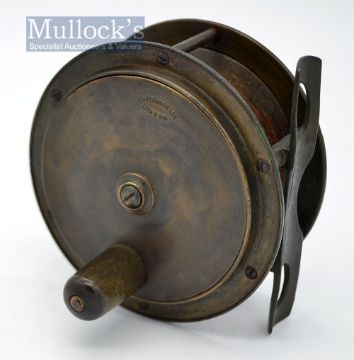 A Carter & Co Ltd London Hercules style brass salmon reel: 4”dia, smooth waisted and perforated brass foot, fat horn handle – plate wind sticks slightly