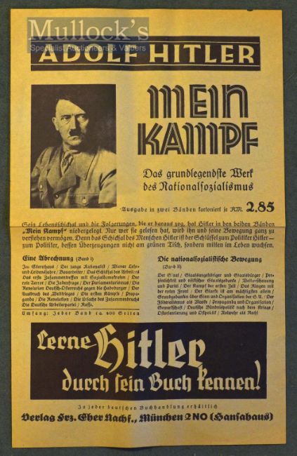 Poster advertising ‘Adolf Hitler Mein Kampf’ – Understand Hitler from his book, promoting his manifesto C.1930s, measures 32x50cm approx., heavy folds, o/w in good condition