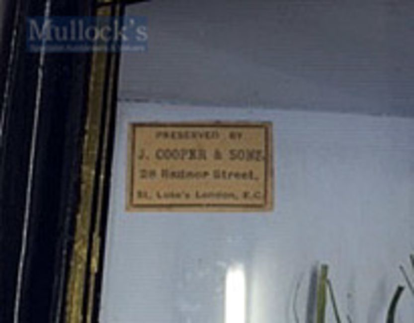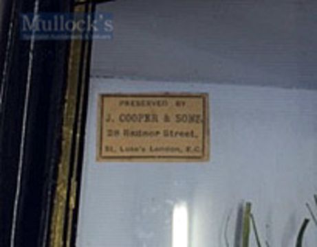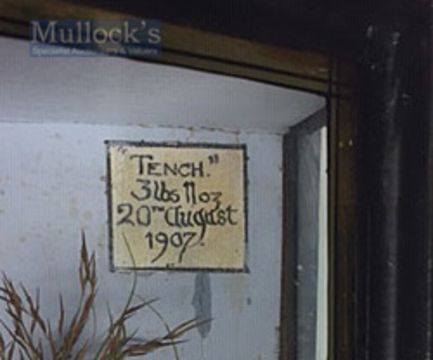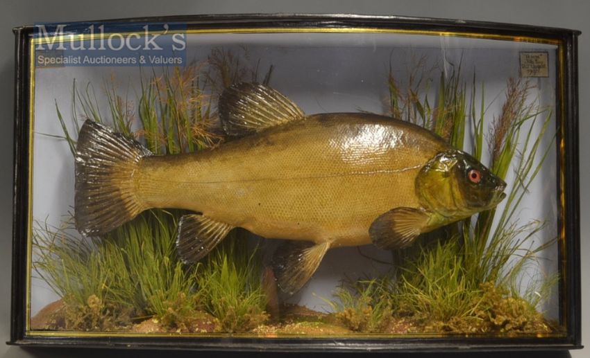 Early J Cooper & Sons 28 Radnor Street preserved Tench dated 1907 - mounted in glass bow fronted case with makers label to the top left hand corner c/w label to the top right corner “ ‘Tench’ - 3lbs 11oz-20th August 1907” overall 13.5” x 23.75” x 6.5”