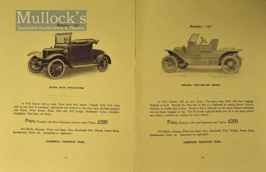 “Stanley Steam Cars Descriptive Catalogue Latest Models” Works at Ashtead & Sunderland 1914 An impressive 20 page sales catalogue illustrating and detailing with prices their range of 5 models of steam cars starting from £250 for a 10 Hp car to £495 for a 20 Hp Coupe model. Printed on fine quality semi-gloss paper in card cover with photograph of their Victoria Works at Ashtead tipped in on front cover, size 7¼” ´ 9½”., in good condition, scarce.
