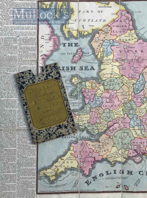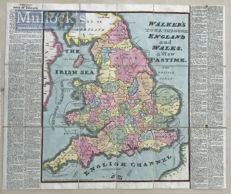 1809 W&T Darton Map - Walker’s Tour Through England and Wales a New Geographical Pastime - published for the author Jan 2nd 1809, with ‘Direction for making the Tour of England’ text to either side from No1 Maidstone, Kent through to No118 London, in colour, backed on linen, with original carded slipcase, overall signs of light wear, light foxing to text in places, opened measures 66x55cm approx.
