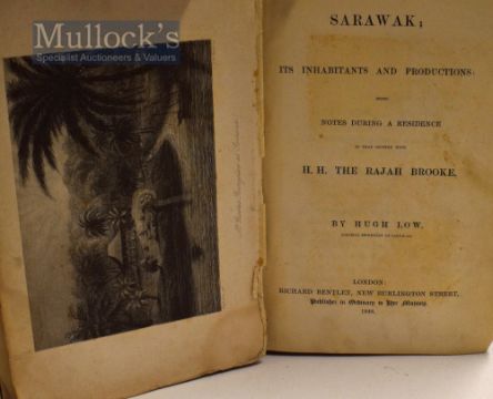 Sarawak It’s Inhabitants And Productions Being Notes During A Residence In That Country With H.H. The Rajah Brooke by Hugh Low 1848 Book A 416 page book with 7 plates. Extensively describing the land its mineral. and agricultural resources, various tribes, sea and land Dyaks, describing the support of Rajah Brooke for tribes attacked by others and efforts to develop his then new lands etc etc. In original marble board binding with cloth spine, size 5¾” × 8¾”.