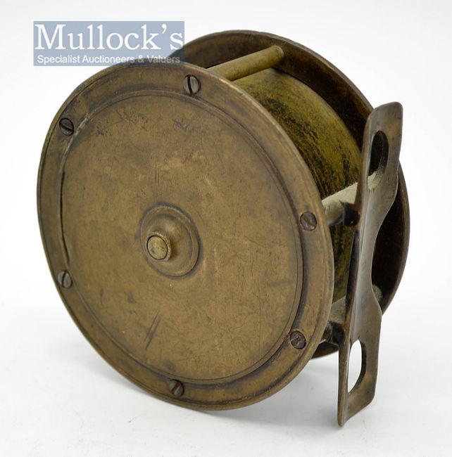 Macleay Inverness Hercules style brass wide drum salmon fly reel - 3.5” dia, with brass waisted oval perforated foot slight knock to one end – constant check –some minor knocks to the back plate rim - runs smoothly