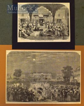 India – ‘Fireworks at Moorshedabad, from a Native drawing’ Original Engraving 1858 35x24cm mounted on card, together with ‘The Nawah of Moorshedabad at Prayer’ 1857 1857 24x18cm mounted on card (2)