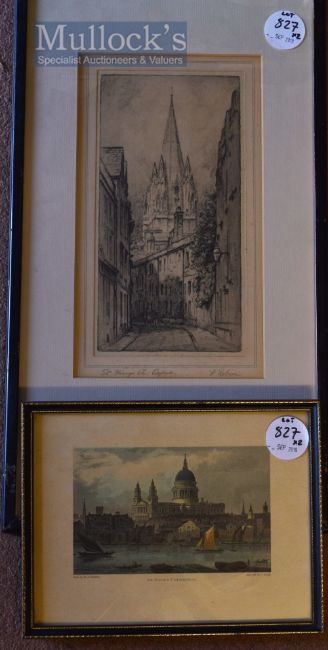 F Robson Signed Etching ‘St Mary’s Church, Oxford’ framed measures 28x50cm together with St. Paul’s Cathedral print framed measures 25x20cm approx. (2)