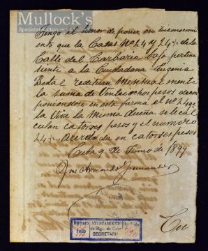 Cuba - 1899 manuscript signed by Emilio Bacardi during the Spanish American War (1898 - 1902). Signed as Mayor of the Santiago de Cuba, with seal of the Mayor next to Emilio's name. Emilio Bacardi was the son of Facundo Bacardi, who was the founder of Bacardi Rum. A 4pg. manuscript, approx., 18cmx 22cm (folded) with 2 pages of writing. The manuscript discusses a specific house and owner and monthly payments made.
