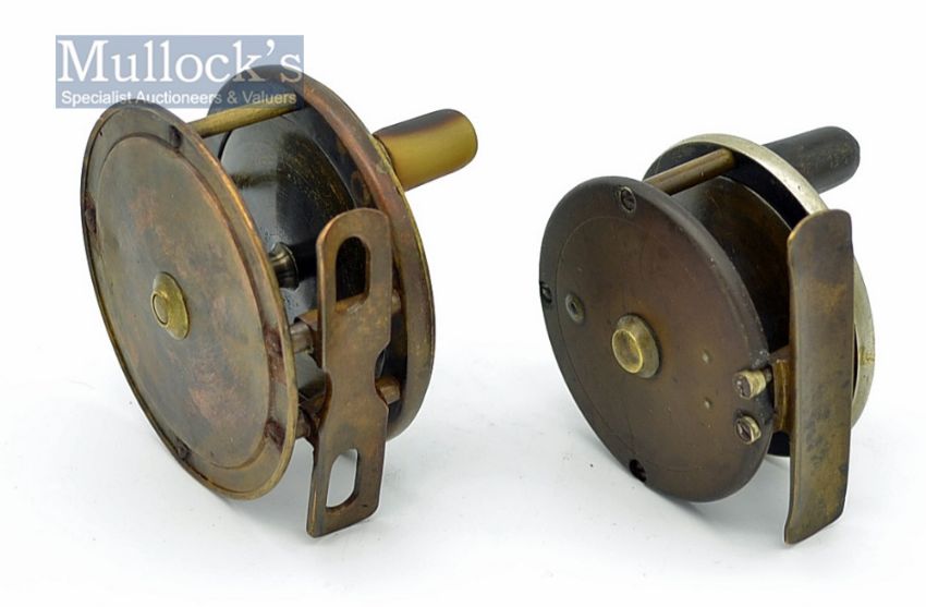 Hardy Bros and Carter London brass trout fly reels (2) – Hardy Bros Alnwick small combination brass and ebonite fly reel – 2.5” dia with nickel silver rim, smooth brass foot with some knocks – check poor – and chip to the rear ebonite back plate next to the foot bridge (AF); and a Carter & Co London 3” dia with perforated hour glass foot ( one knock) , handle cracked and runs a bit tight in places