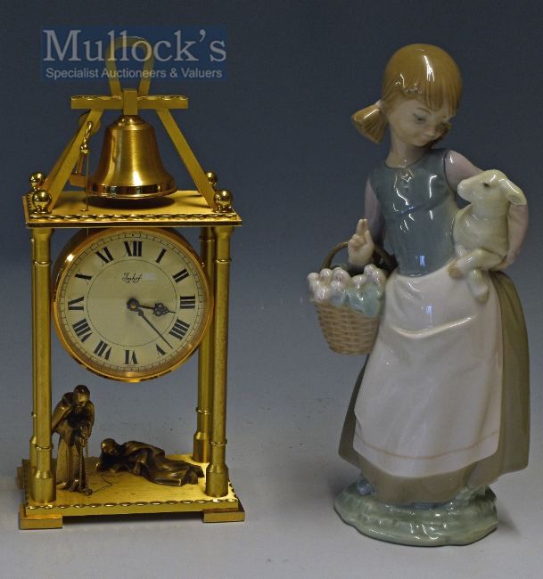 Swiss Imhof ‘Frere Jacques’ Gilt Bronze Mantel Clock Ref .82/731 ‘Frere Jacques’, with monk automation ringing bell, with another sleeping monk, within four pillars, enamel dial with ‘Imhof’ to centre of Roman Numerals, requires chain reattaching for bell, o/w appears to work at time of cataloguing, together with a Lladro Girl and Lamb Figurine appears in good condition (2)