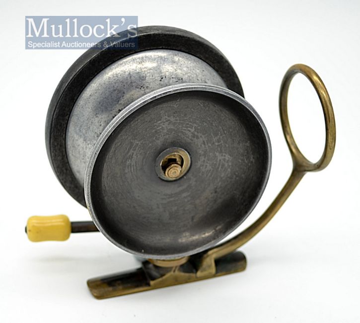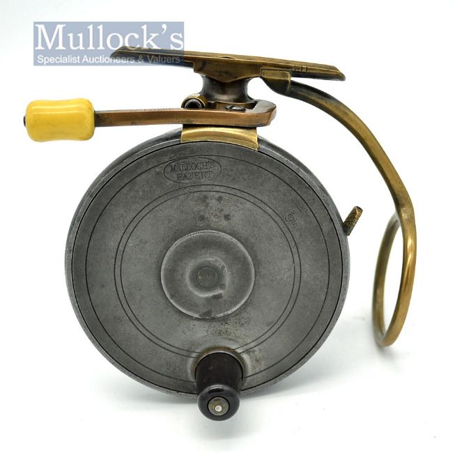 Malloch Patent alloy and brass side casting salmon reel - 4” dia, with quick release reversible drum, black horn handle, on/off rim check, Malloch Patent side locking lever with ivorine handle, brass casting eye, good finish throughout and runs well – small amount of solder to brass spring release housing?