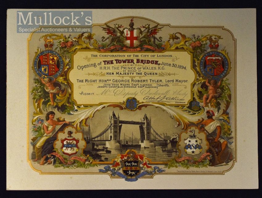 Opening Of Tower Bridge By H.R.H The Prince Of Wales 1894 Invitation A very beautifully multicoloured Invitation showing the Bridge with allegorical figures, Royal, City of London & other Coats of Arms etc. Attractively printed by Blades, East & Blades, size 12” × 8¾” in good condition