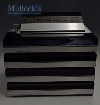 Vintage 1980s Bang and Olufsen ‘Beosystem 5500’ in aluminium body and includes Beomaster, Beogram, Beogram CD, Beocord, Master Control Panel 5500, a Beolink 1009 remote control (missing some buttons) and 2x Type 6514 Speakers (1x wire cut missing connector) – also includes a Reproduction Cabinet with shelves to house all sections, measuring 84cm height x 60cm width x 47cm depth appears in good condition overall (plugs removed but included) Please Note: Not suitable for posting, collection only