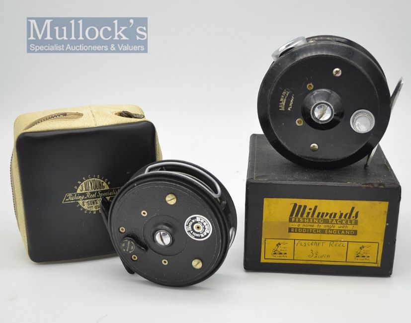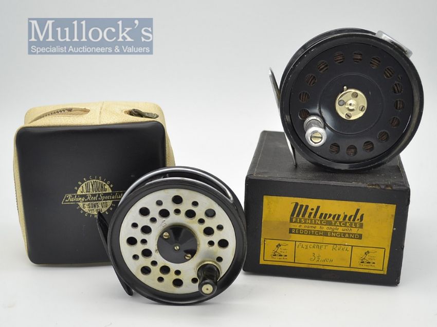 2x Redditch made alloy fly reels in makers box or case – unused J.W Young and Sons Beaudex 3” dia for either left or right hand wind in makers padded case; and Milwards Flycraft 3.5” dia RHW, alloy line guide, handle, chrome foot and rear back plate tension adjuster – c/w line and comes in original mob