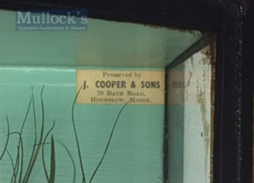 J Cooper & Sons 78 Bath Road Hounslow Middx preserved Roach dated 1936- with pale green back board - mounted in glass bow fronted case with makers label to the top right hand corner c/w original period gilt inscription “Roach 1lb 14oz - 6Caught at Pangbourne by J Westwood, March 1936” overall 11.5” x 19” x 5.5” – there are 2x small grain cracks to the back board not visible through the glass – all original.