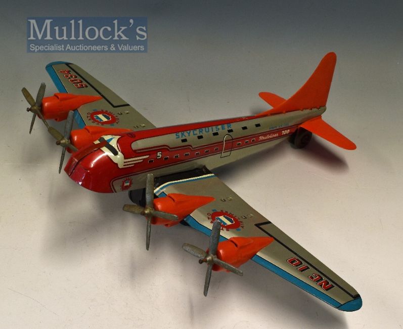 Marx Toys Tinplate Friction Driven Stratoliner 700 Skycruiser Toy Plane marked Strato Air Lines, marked NC10 5034 to the wing, in silver, red and blue, plastic tail wings and propeller covers, measures 35x7cm approx. a nice example, with light wear as expected