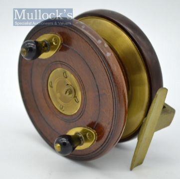 News of The World Prize Reel – Slater style Nottingham wooden and brass star back reel – 4.5” dia with rear brass drum flange and rear lined back plate – on/off check – spins well and in near original condition – plaque has been re-glued.
