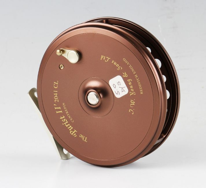 W Young Purist 2-2041 4.75” alloy Centrepin reel: New condition, 6 spoke Aerial pattern with tension regulator, line guide and ratchet check, c/w COA and papers, in MOB.