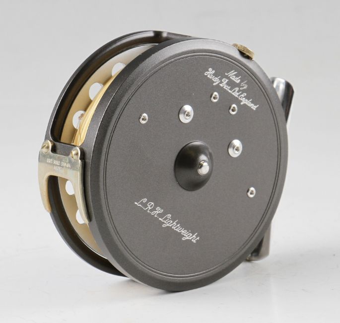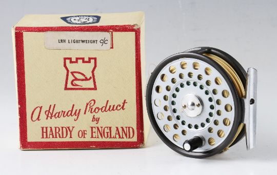 Fine Hardy Bros The L.R.H Lightweight alloy fly reel: 3 1/8” dia with smooth alloy foot, reversible “U” shaped lined guard – c/w Aircel Supreme DT6F line and makers original box – appears unused – to be used with the previous lot rod