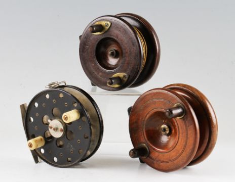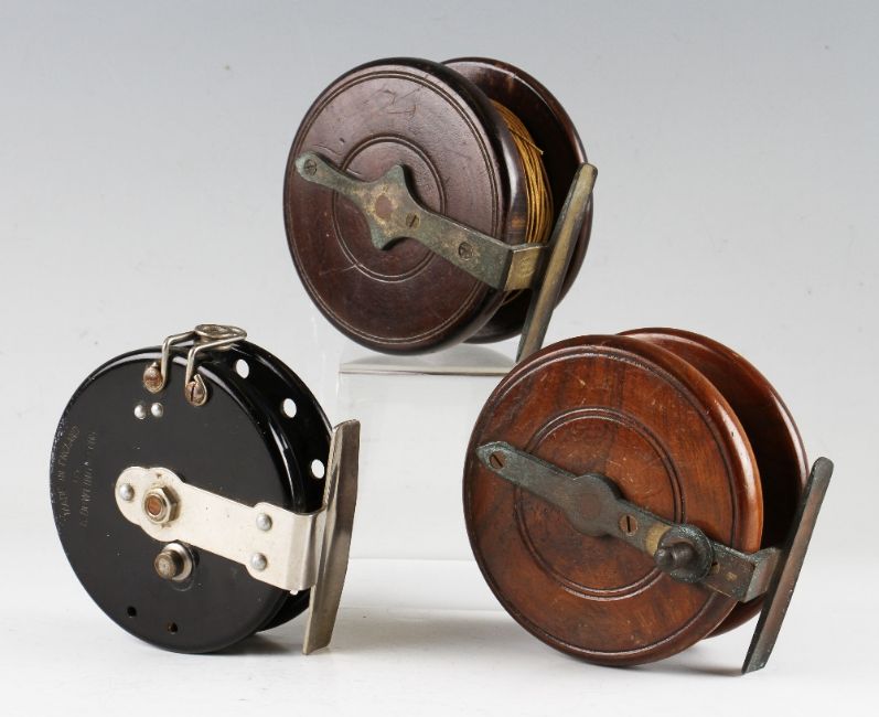 3x various reels: 2x 4” Nottingham wooden and brass strap back fly reels both with line and on/off check buttons (g) and K Dowling & Sons 3 7/8” centre pin casting reel - black anodised finish with quick drum release latch, chrome foot – on/off check button - needs a bit of oil to loosen up.