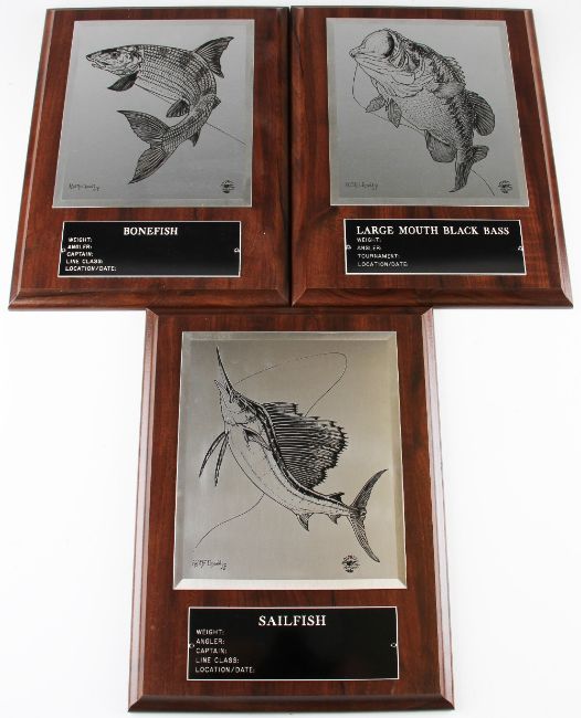 3x Osprey Collection Trophy Tournament Fish Plaques – each mounted on matching mahogany wall plaques by Keith Linsell – to incl Large Mouth Black Bass; Bonefish; and Sailfish – each with matching detailed plaques below – overall 12” x 9”