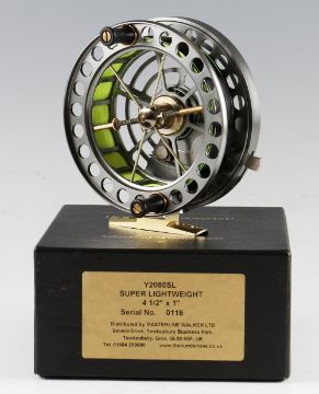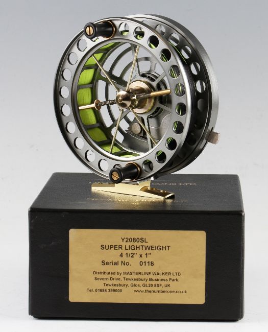 J W Young & Sons Centre Pin Y2080SL Fishing reel, 4.5”x1, 6 spoke, twin black handle, smooth brass perforated foot, super lightweight constitutes the ultimate in centre pin reel design, features click check, 2 ball bearings, micro-adjustable disc drag, unique cutaway cage less construction. c/w line Brand New in MOB